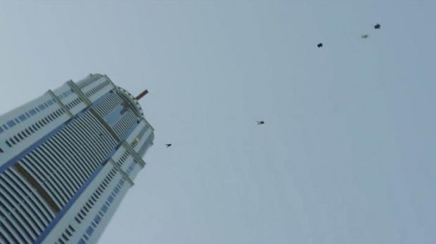 Locuitorii care locuiesc în turn şi trecătorii ocazionali se bucură şi ei din plin de cascadoriile paraşutiştilor.