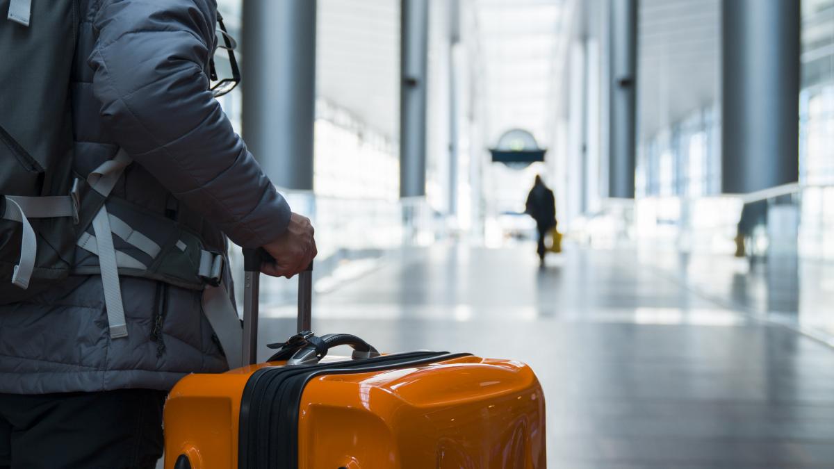 barbat cu un troller in aeroport