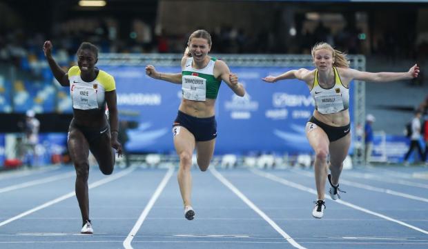 Foto interior: Kristina Țimanovskaia (centru), în finala probei de 200 metri femei de la Universiada de Vară desfășurată în 2019 la Napoli, unde a câștigat medalia de aur