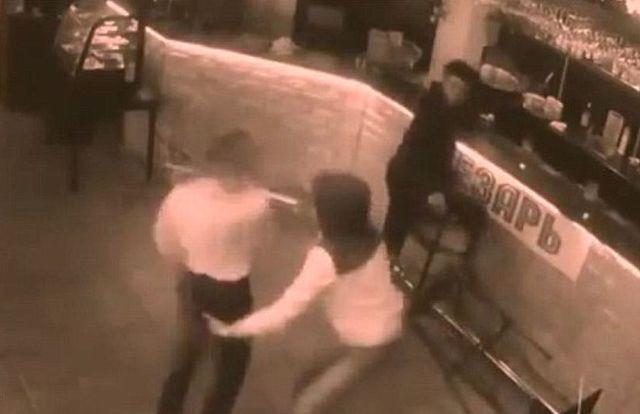 În loc să o lase în pace, clientul o apucă pe fată de fund, aşa că, aceasta reacţionează din nou.