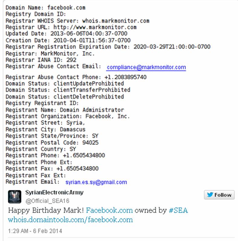 Hackerii au anunţat "spargerea" pe Twitter. O căutare pe domeniul WHOIS indică că mai multe adrese de mail, ale utilizatorilor Facebook, au fost schimbate cu un cont de Gmail sirian.