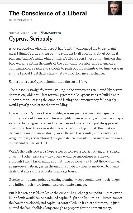 Krugman, al cărui blog este găzduit de site-ul New York Times, susţine că ieşirea din zona euro este un scenariu favorabil Ciprului, care riscă să repete experienţa Greciei.