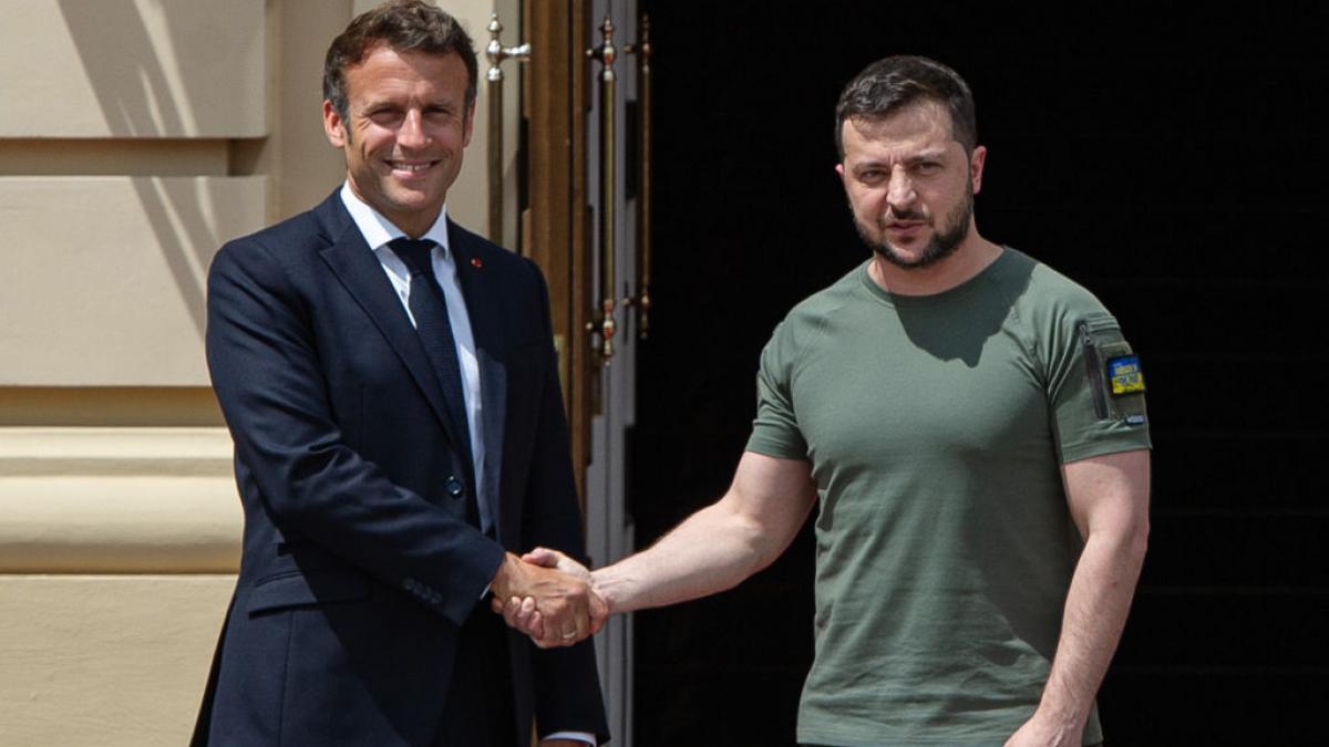 Emmanuel Macron îi strânge mâna lui Volodimir Zelenski.