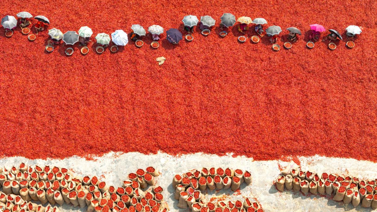 În fiecare an, în Bogura, Bangladesh, se cultivă mii de tone de ardei iute roșu de calitate, având o greutate echivalentă cu sute de elefanți adulți. Imaginile spectaculoase cu lucrătorii care usucă chili surprind marea nesfârșită de roșu.