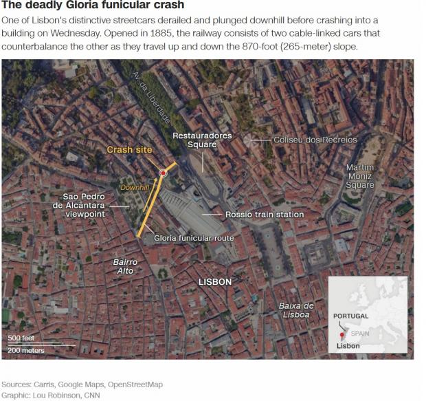 Jurnaliştii de la BBC au scris că miercuri, puţin după ora 18:00, ora Portugaliei, funicularul, similar unui tramvai şi foarte popular printre turişti, a deraiat într-o curbă aflată pe o stradă abruptă, pavată cu piatră cubică. Având viteză destul de mare, acesta s-a izbit de mai multe clădiri şi, ulterior, s-a prăbuşit, au spus mai mulţi martori.
