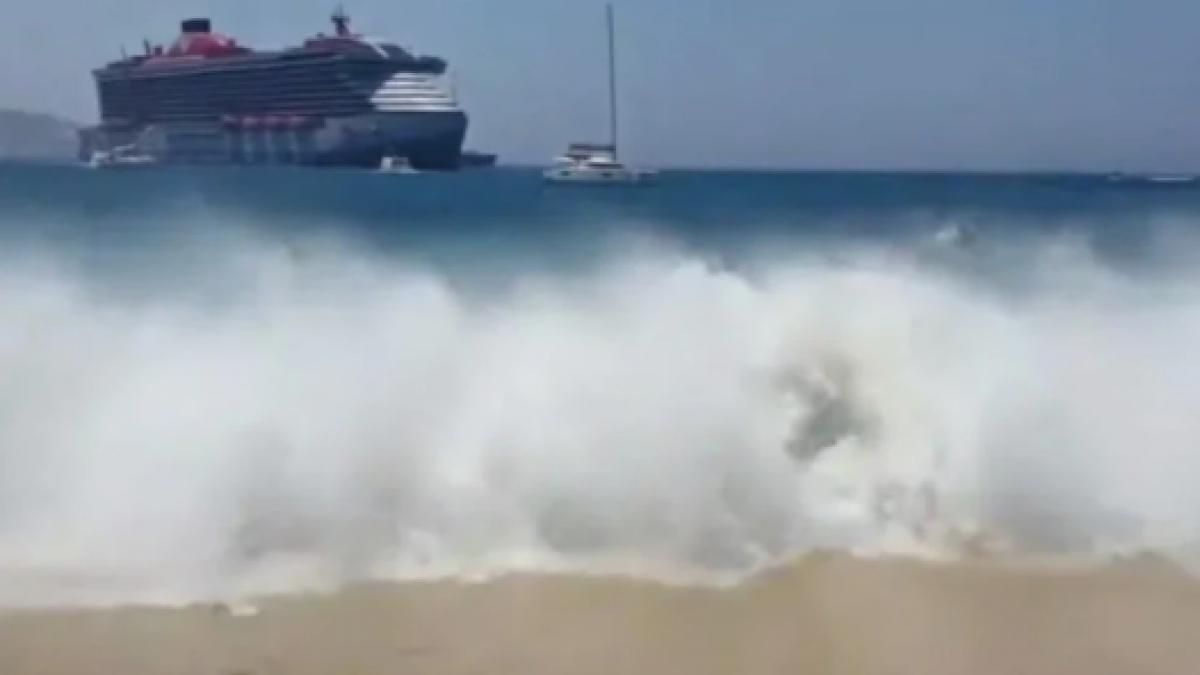 Momentul a fost surprins de mai multe persoane, iar filmarea a devenit virală. În imagini se vede cum un val provocat de navă a măturat malul, iar șezlongurile, toboganele și umbrelele de pe plajă au fost spulberate de ape.