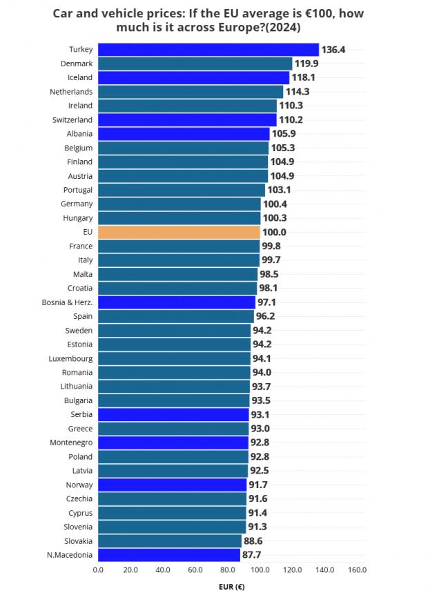 Turcia este, de departe, cea mai scumpă țară pentru mașini și alte vehicule personale dintre cele 36 analizate. Prețurile sunt cu 36,4% mai mari decât media UE, ceea ce înseamnă că un vehicul care costă 100 de euro în Uniune ar costa 136,4 euro în Turcia. Totuși, această valoare a scăzut ușor față de 2021, când indicele era de 147,10 euro.