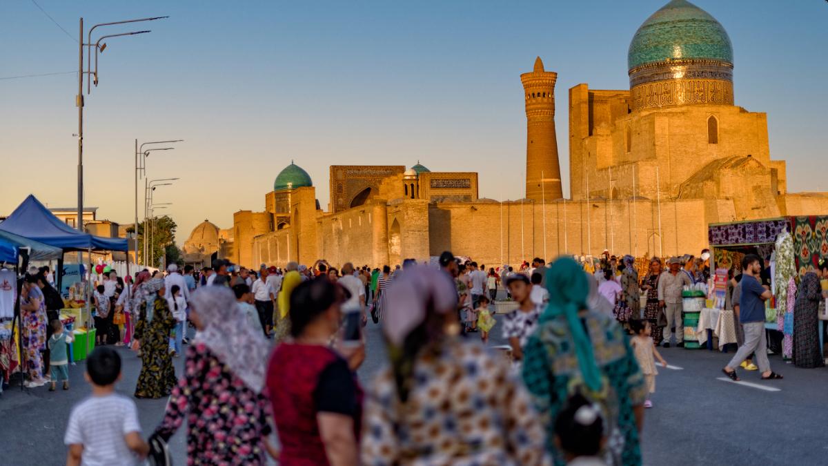 Oameni pe stradă, lângă moscheea albastră din Bukhaara, Uzbekistan. Sursa foto: Getty Images