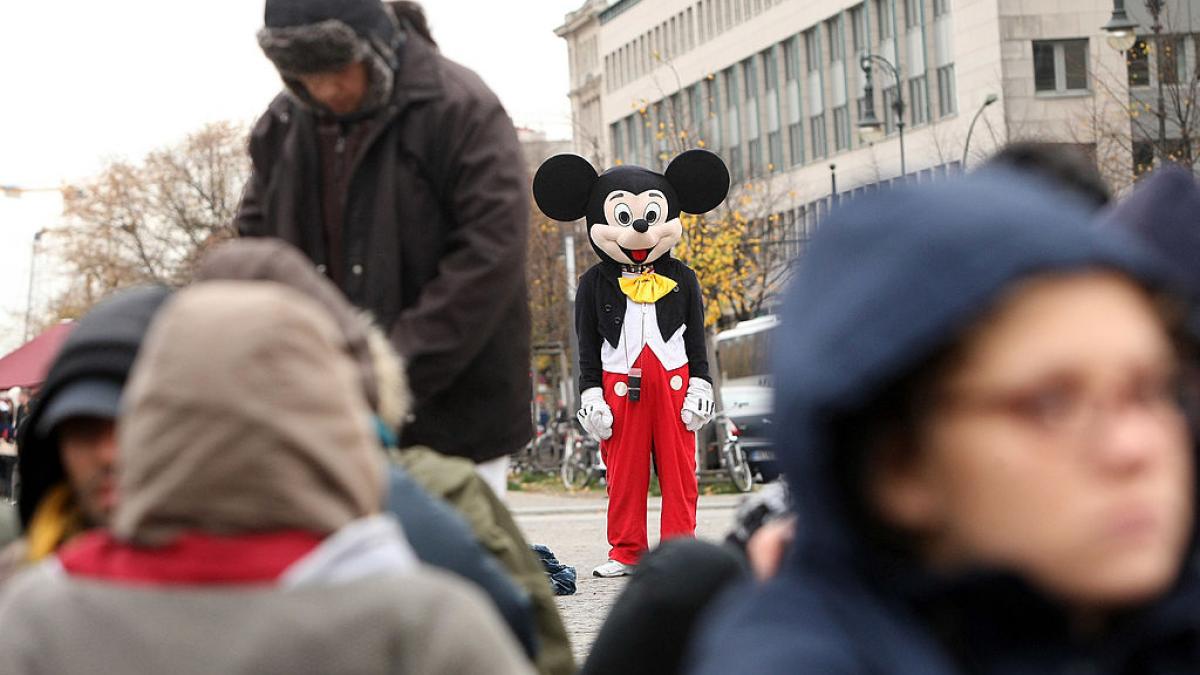 O persoana costumata in Mickez Mouse pe strada printre oameni