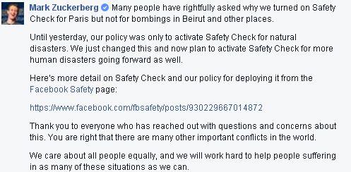 ”Mulți oameni s-au întrebat de ce Safety Check a fost activat pentru Paris, dar nu și pentru Beirut și alte locuri. Până ieri, politica noastră era de a nu activa Safety Check decât în cazul dezastrelor naturale. Tocmai am schimbat acest lucru și avem de gând să apelăm la Safety Check și pentru dezastre produse de oameni”, a declarat șeful Facebook.
