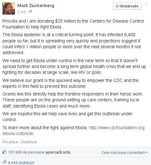 Potrivit unei postări publicate pe pagina sa de Facebook, prin această donaţie Zuckerberg pune umărul la stoparea epidemiei de Ebola care, altfel, riscă să scape de sub control şi să devină o problemă mult mai mare şi mai costisitoare, precum virusul HIV.