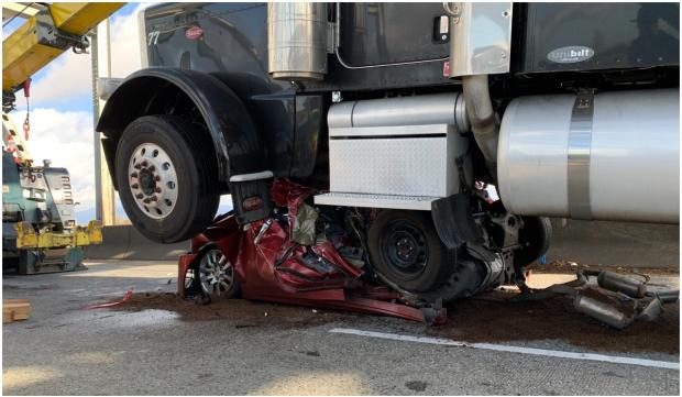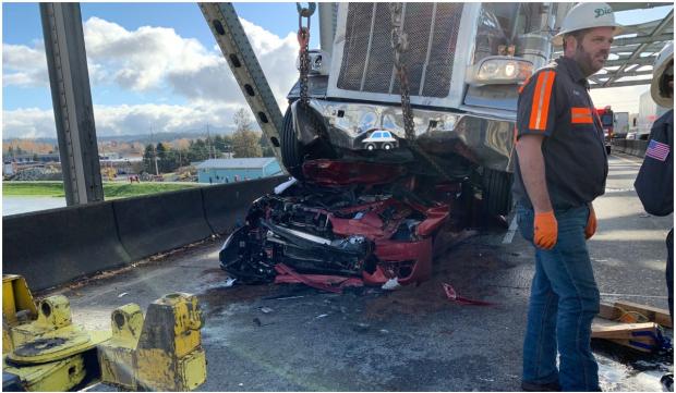 Mașina, un Nissan Altima a fost lovită din spate de camion, a pliat-o în jumătate și apoi s-a rostogolit deasupra mașinii, zdrobind vehiculul, în județul Skagit.