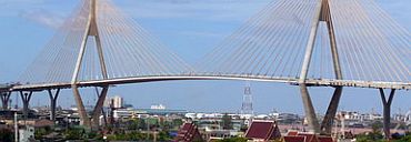 Puţin mai departe, în Bangkok, se lucrează la o altă construcţie impresionantă: The Bangkok Mega Bridge este de asemenea alcătuit din două poduri distincte care traversează râul Chao Phraya.