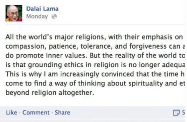 "De aceea am tot mai mult convingerea că a venit timpul să găsim o modalitate de a ne gândi la spiritualitate şi la etică dincolo de religie", a scris Dalai Lama pe Facebook.