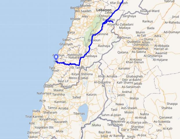 În imaginea următoare, râul Litani este figurat cu albastru.