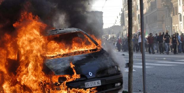 Mişcarea "Occupaţi Wall Street" a degenerat în violenţe de nedescris, cel puţin in Italia. Grupuri de persoane neidentificate au spart geamurile unor bănci şi au incendiat două maşini şi o clădire oficială.