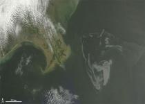 Forma triunghiulară care se vede în partea dreaptă a fotografiei este locul în care soarele se reflectă din pata de petrol care a ajuns la suprafaţă, şi, după cum se vede din legendă, aceasta are diametrul de 24 de kilometri.