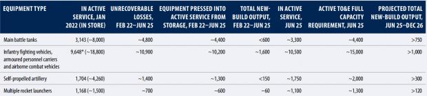 Conform raportului IISS, în privința tancurilor, de pildă, Rusia avea în jur de 3.000 operaționale la începutul invaziei în Ucraina și în jur de 8.000 în depozite/stocate. Armata rusă a pierdut „în mod ireversibil” în jur de 4.800 de astfel de blindate, dar pentru anul acesta și 2026, industria de război e estimată că poate produce în jur de 750 de astfel de vehicule/an.