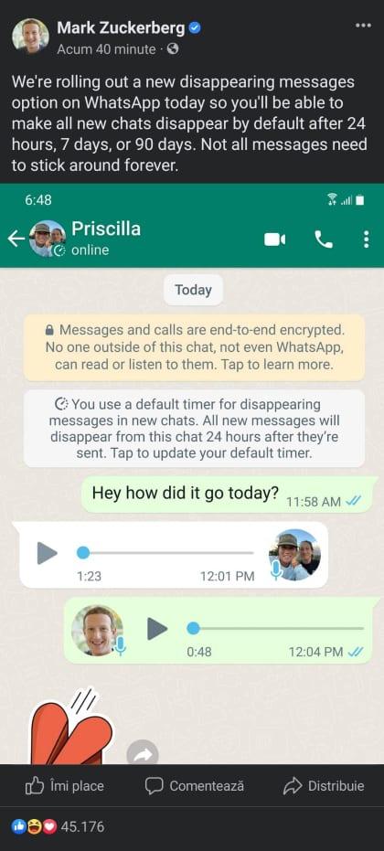 ”Lansăm astăzi o nouă opțiune de mesaje care dispar pe WhatsApp, astfel încât veți putea face ca toate chaturile noi să dispară în mod implicit după 24 de ore, 7 zile sau 90 de zile. Nu toate mesajele trebuie să rămână pentru totdeauna”, a scris acesta.
