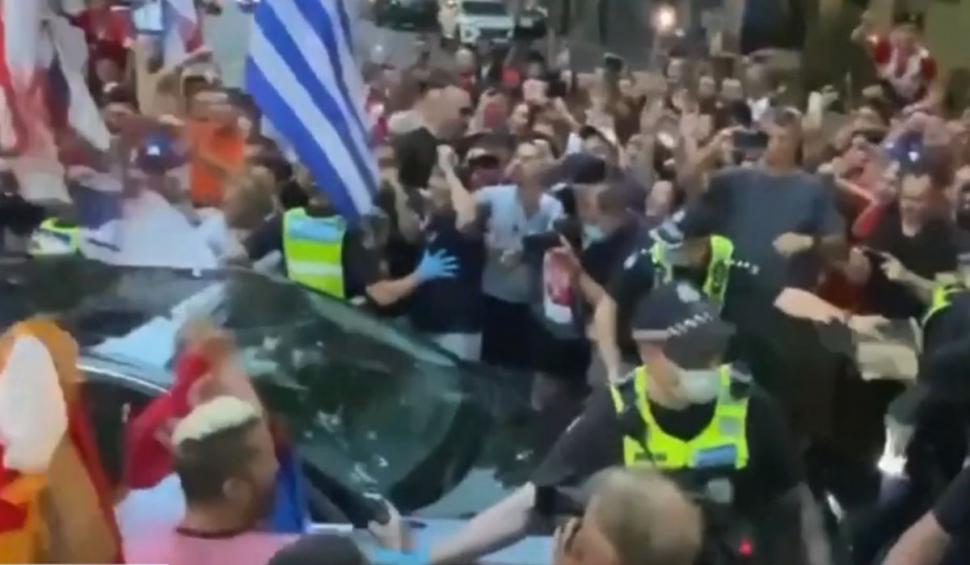 Sute de persoane au luat cu asalt mașina în care se deplasa Novak Djokovic. Forțele de ordine încearcă să facă loc, pentru ca autoturismul să se poată deplasa.