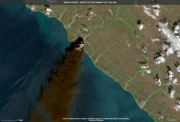 Imagine realizată pe 16 aprilie de satelitul ESA Sentinel/Copernicus care arată un nor des de fum provocat de incendiul de la rafinăria Tuapse de pe coasta Mării Negre, după un atac cu drone ucrainene