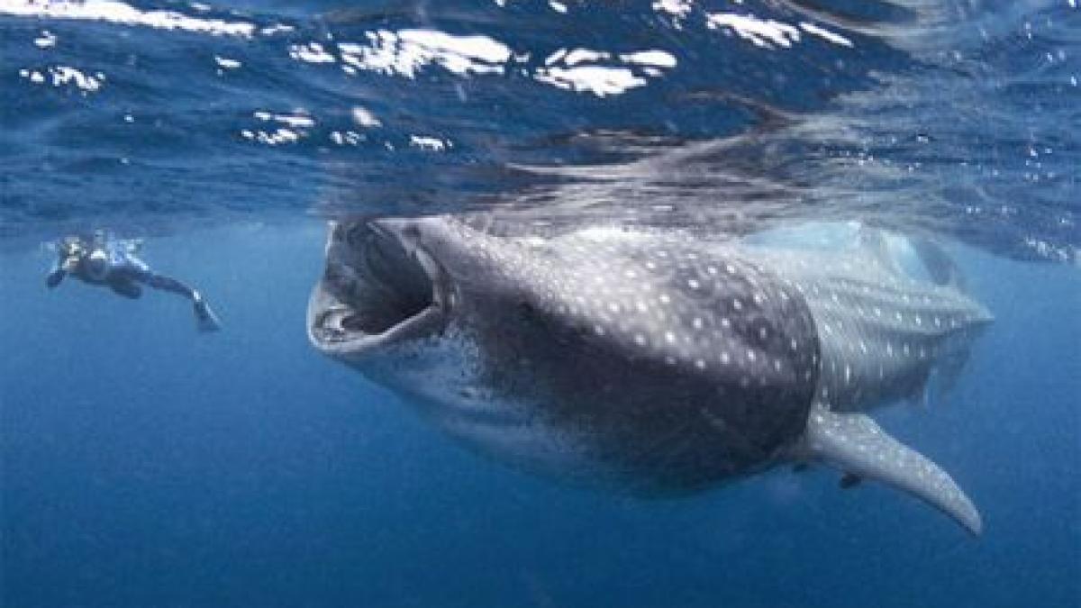 Chiar înainte cu aproximativ un metru de a ajunge la caiacul salvatorilor, o balenă cu cocoaşă a ieşit la suprafaţă cu gura deschisă larg înghiţind zeci de peşti.