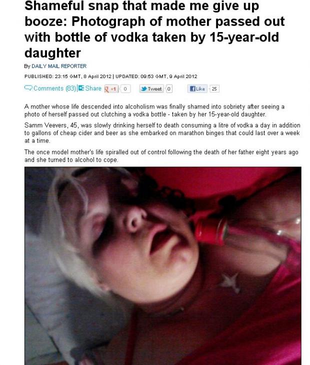Samm Veevers, în vârstă de 45 de ani, obişnuia să consume zilnic un litru de votcă. Mamă a trei copii adolescenţi, femeia a căzut în patima alcoolului în urmă cu opt ani, când i-a murit tatăl.