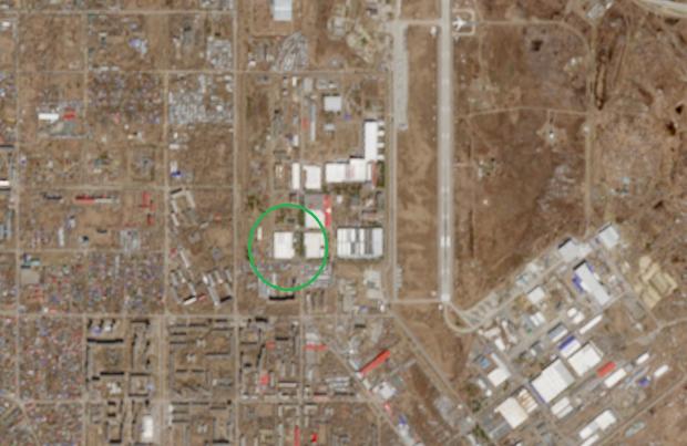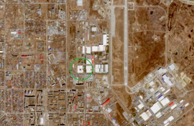 Imaginile, deși la o rezoluție mai slabă, arată că, pe data de 10 aprilie 2026, clădirea „atelierului 46” a fabricii „Iuri Gagarin” era intactă (clădirea albă în cerc verde).