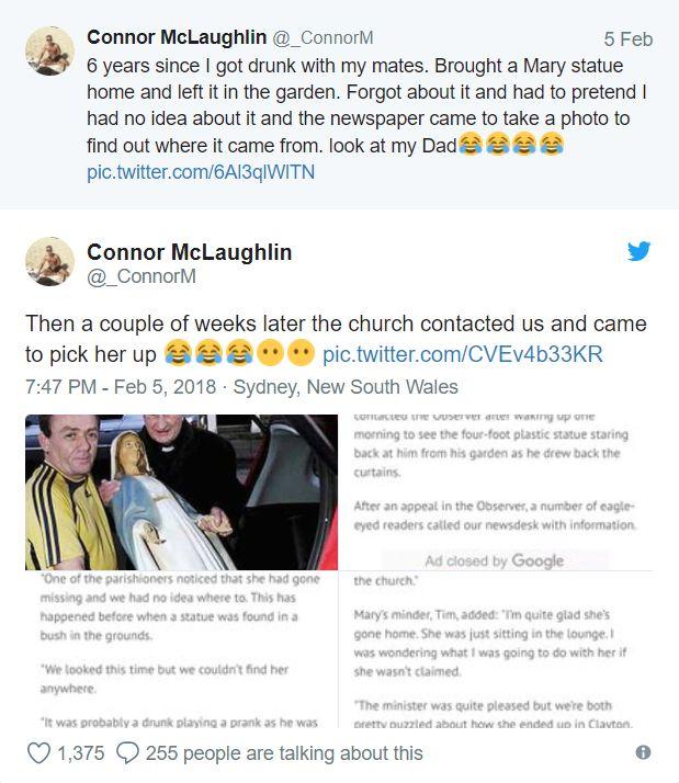 ”Șase ani de când m-am îmbătat criță cu prienii mei. Am adus acasă statuia cu Fecioara Maria și am lăsat-o în grădină. Am uitat de ea și m-am prefăcut că n-am nicio idee despre obiectul sfânt. Ziariștii au venit apoi să facă o poză și să afle de unde a venit statuia. Câteva săptămâni mai târziu, o biserică ne-a contactat și a venit să o ridice. Mi-a luat ani să recunosc”, a mărturisit Connor.