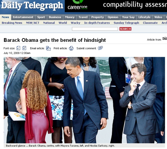 Slăbiciunea preşedintelui american pentru femeile frumoase a mai fost în atenţia presei, în vara anului trecut. Cel mai puternic om al planetei a fost surprins în timp ce-i admira formele unei brazilience focoase. Totul s-a petrecut în localitatea L'Aquila unde a avut loc Summit-ul G8.
