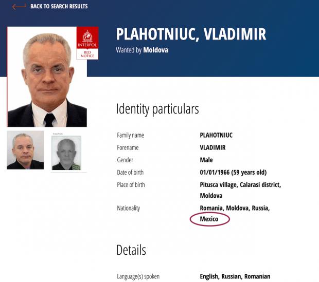 Vladimir Plahotniuc figurează în baza de date a Interpol ca fiind căutat inclusiv în baza cetățeniei mexicane. Informația este publicată pe site-ul Interpol și a fost confirmată pentru ZdG de către Viorel Cernăuțeanu, șeful Inspectoratului General al Poliției. „Cu siguranță nu poate să fie un pașaport legal obținut”, a precizat șeful Poliției.
