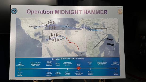 Atacul militar al SUA împotriva Iranului de sâmbătă a primit numele de cod „Midnight Hammer” și a implicat peste 125 de aeronave și o operațiune de diversiune în care au fost desfășurate bombardiere peste Pacific ca „momeală”, a declarat duminică generalul Dan Caine, șeful Statului Major, într-o conferință de presă la Pentagon. Secretarul american al Apărării Pete Hegseth a adăugat la rândul său că misiunea bombardierelor B-2 a fost cea mai lungă ca distanță din anul 2001 încoace și a fost prima utilizare a bombei MOP (Massive Ordnance Penetrator, așa numitele „distrugătoare de buncăre” n.red).