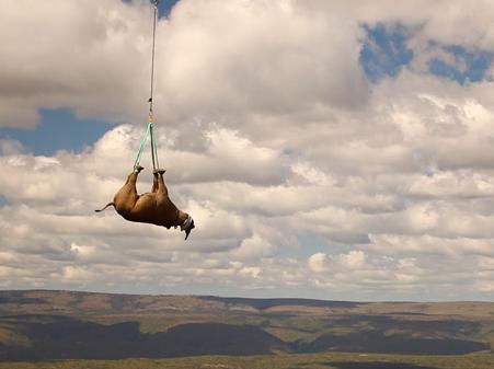 Pentru a fi salvate de braconieri, 19 animale au fost atârnate de un elicoper şi mutate la peste o mie de kilometri distanţă. În ciuda modalităţiii ciudate de transport, animalele nu au părut niciun moment deranjate.