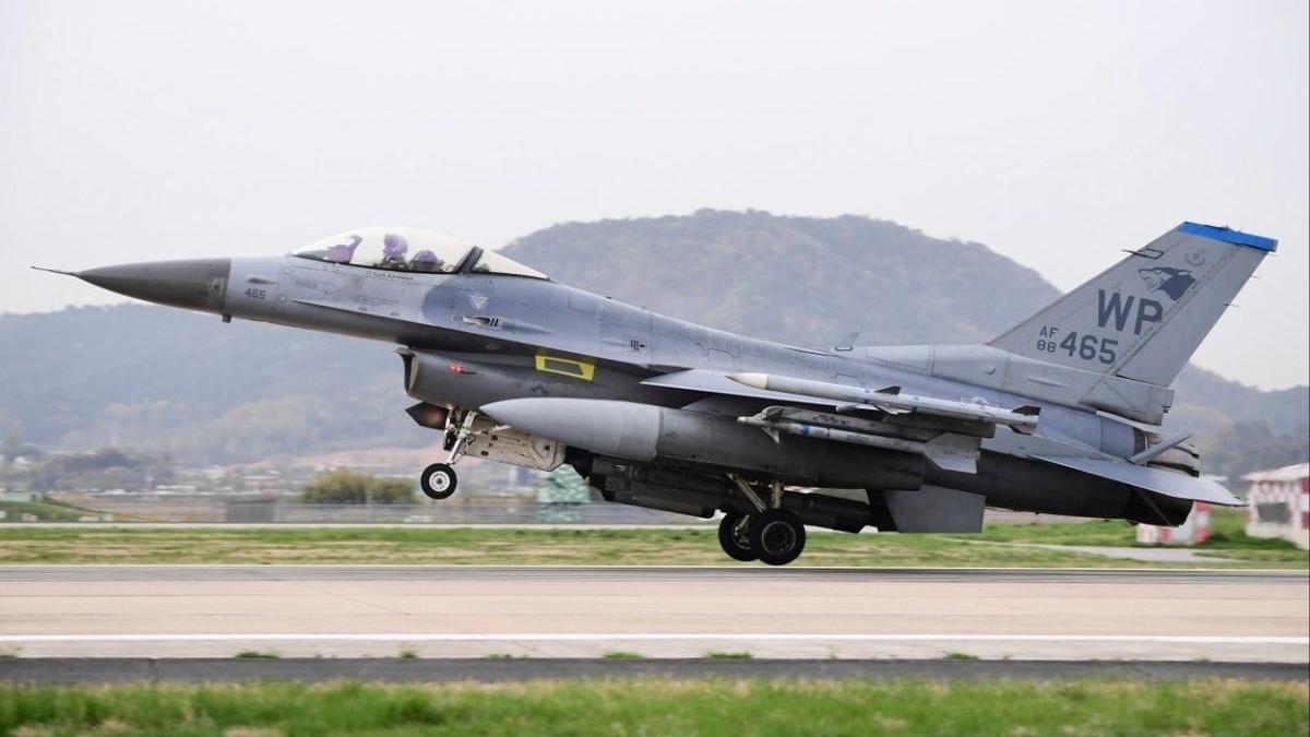 Foto: aparat F-16 surprins în timpul unei aterizări la baza aeriană Gwangju din Coreea de Sud, 14 aprilie 2023