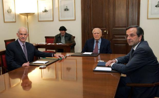 Numele noului premier şi componenţa cabinetului vor fi stabilite astăzi, în cadrul unei noi întâlniri a celor doi lideri politici. Printre favoriţii se numără actualul ministru de finanţe Evangelos Venizelos şi Antonis Samaras