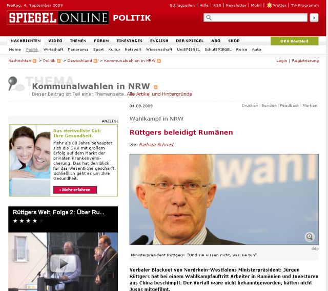 Mai mult, şi revista Spiegel a preluat, vineri, cuvintele rostite de acesta pe 26 august. Primul ministru Jürgen Rüttgers nu ar fi intenţionat însă să-i atace pe muncitorii români prin discursul său ci doar să scoată în evidenţă nivelul înalt de calificare al forţei de muncă din Bazinul Ruhr, potrivit oficialilor conservatori de la Düsseldorf, citaţi de Deutsche Welle.