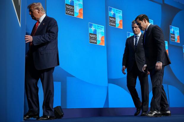 Donald Trump, secretarul Apărării SUA, Pete Hegseth, și secretarul de stat american Marco Rubio părăsesc scena la summitul NATO de la Haga, de anul trecut. Foto: Getty Image