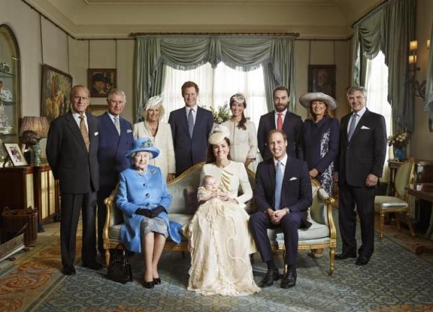 În braţele mamei, la fel de cuminte cum a fost în tot timpul botezului, prinţul George este eroul zilei şi în portretul familiei regale. Alături de părinţii care radiau de fericire se află străbunica: regina Elisabeta a II-a. Cu toţii sunt înconjuraţi de rudele apropiate, de la prinţul consort Philip la mătuşa lui George, Pippa Middleton, devenită, ea însăşi, o celebritate mondenă.