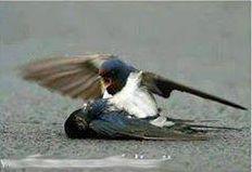 Rândunica a căzut pe trotuar, lovită puternic. În momentul în care şi-a dat seama că partenera lui nu mai este alături de el, masculul s-a dus şi i-a adus ceva de mâncare, îngrijind-o cu multă afecţiune.