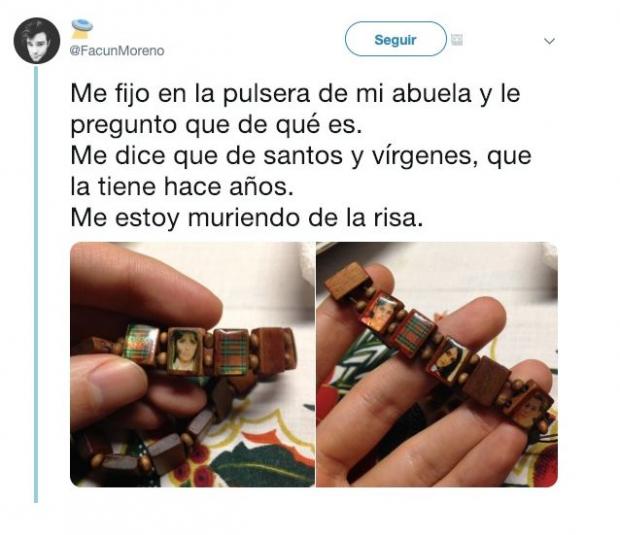 „M-am uitat la brățara pe care o purta bunica și am întrebat-o de ce o ține la mână. Mi-a răspuns că sunt sfinți și că o are de foarte mulți ani. Am murit de râs!”, a scris tânărul pe contul său de Twitter.