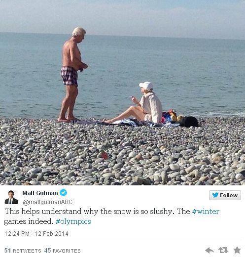 "Am adus cu mine o pereche de pantaloni scurţi şi o pereche de şlapi, pentru că vroiam să îi port prin hotel. Nu mă aşteptam să îi pot îmbrăca la un meci de hochei în Rusia, cu ocazia Olimpiadei de Iarnă, dar e aşa de frumos afară încât am decis să o fac", a spus un alt turist.