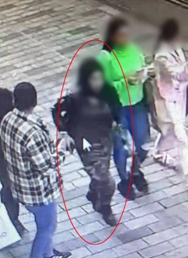 Pe imagini se poate observa că femeia, îmbrăcată în negru şi cu pantaloni de camuflaj, are în spate un rucsac voluminos.