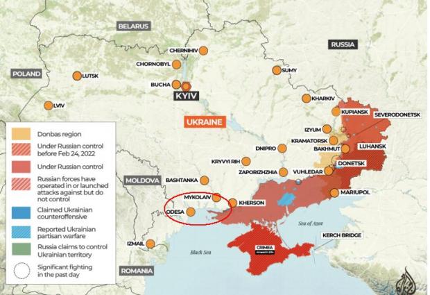 Foto interior: pentru a ajunge în Transnistria, Rusia trebuie să captureze o regiune sudică din Ucraina, pe care n-a reușit să o captureze în cei doi ani de război (porțiunea încercuită)