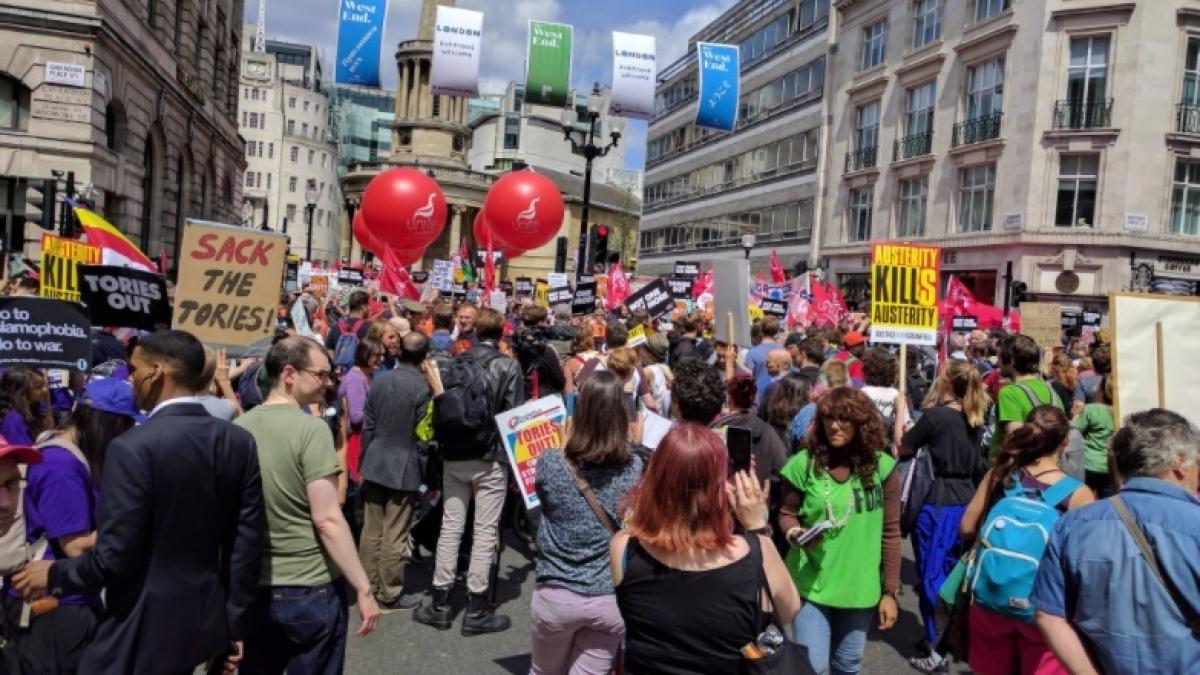 Mii de persoane s-au adunat sâmbătă după-amiază în zona centrală a Londrei pentru a protesta faţă de politicile economice ale Guvernului May. Demonstraţia a fost organizată de către un grup intitulat Adunarea Populară împotriva Austerităţii, scrie BBC și citat de news.ro.