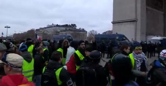 Printre sloganuri a figurat şi "Libertate pentru Christophe!", cu referire la fostul boxer Christophe Dettinger, ex-campion al Franţei, la categoria grea (1,92 m - 91 kg), care a fost filmat lovind doi jandarmi sâmbăta trecută în cursul unei manifestaţii a "vestelor galbene". El a fost reţinut şi plasat în arest preventiv, în aşteptarea procesului.