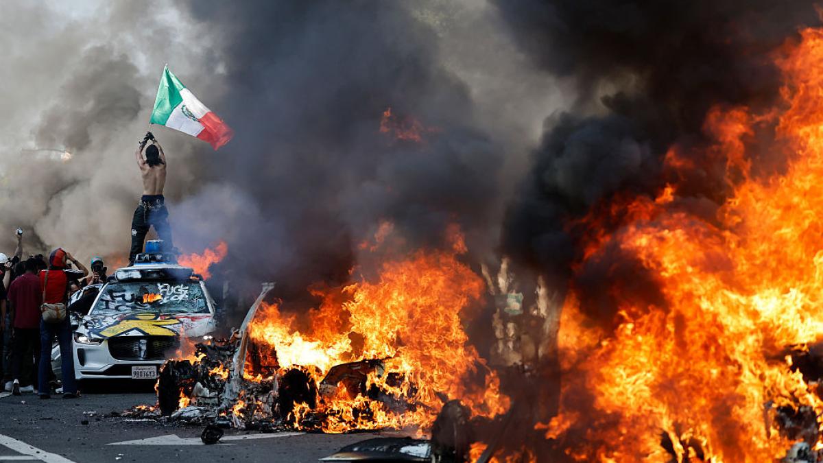 Incendiu de mașini la protestele din Los Angeles. Foto: Getty Images