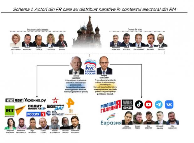 În acest sens, Serviciul a identificat o rețea care la nivelul anului 2024 distribuie sistematic narative pro-Kremlin (inclusiv pro-război) formată din: peste 160 de canale Telegram (110 care reflectă exclusiv situația sociopolitică din RM şi sunt administrate fie de actori anonimi, fie de blogeri/ influenceri pro-Kremlin), celelalte 50 din FR; peste 90 canale Tik-Tok, peste 70 grupuri/ conturi Facebook 43 boturi Vkontakte (scrierea automatizată de comentarii).