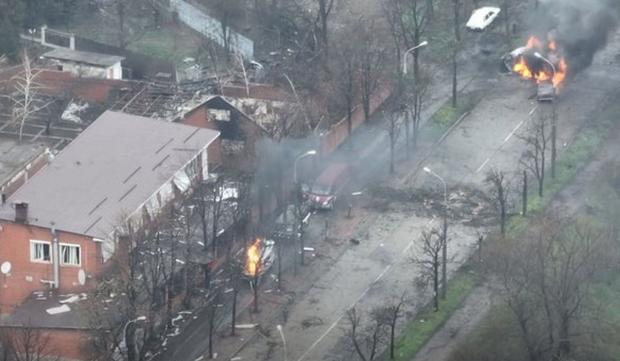 Videoclipul, filmat cu o dronă, arată un convoi de șase vehicule care se deplasează spre sud de-a lungul bulevardului Metalurgiștilor din Mariupol.