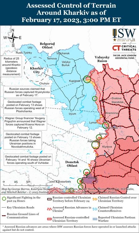 O sursă rusă a susținut că forțele ruse au preluat controlul deplin asupra Hrianykivka, în timp ce alte surse au declarat că luptele sunt în desfășurare în apropierea așezării și că forțele ruse au preluat controlul asupra pozițiilor nespecificate din zona Kupyansk, la aproximativ 45 km nord-vest de Svatove. Un blogger rus a subliniat că forțele ucrainene la nord-vest de Svatove, în zona Kupiansk, se concentrează pe pregătirile defensive pentru acțiunile ofensive rusești și a prezis că forțele ruse pot ataca către Lyman Pershyi și Vilshana, ambele la aproximativ 45 km nord-vest de Svatove. Forțele ruse au continuat, de asemenea, operațiunile ofensive în jurul Kreminnei pe 17 februarie.