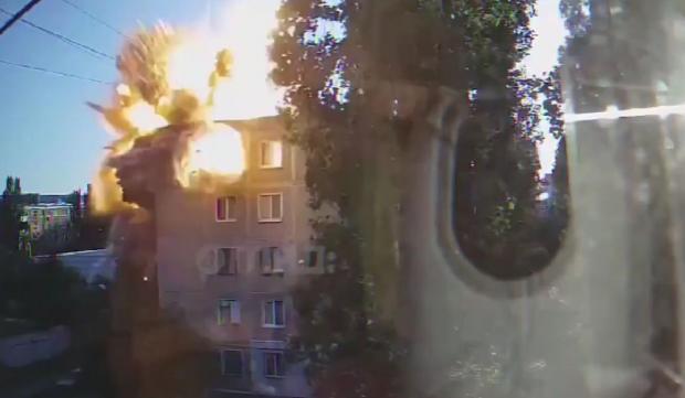 În materialul video, racheta lovește partea superioară a blocului de locuințe sub un unghi ascuțit. Urmează o explozie de mari proporții, care-i spulberă pe locatari.